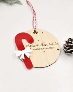 Χειροποίητο ξύλινο στολίδι με plexiglass ζαχαρωτό candy cane και διακοσμητικό φιόγκο.
